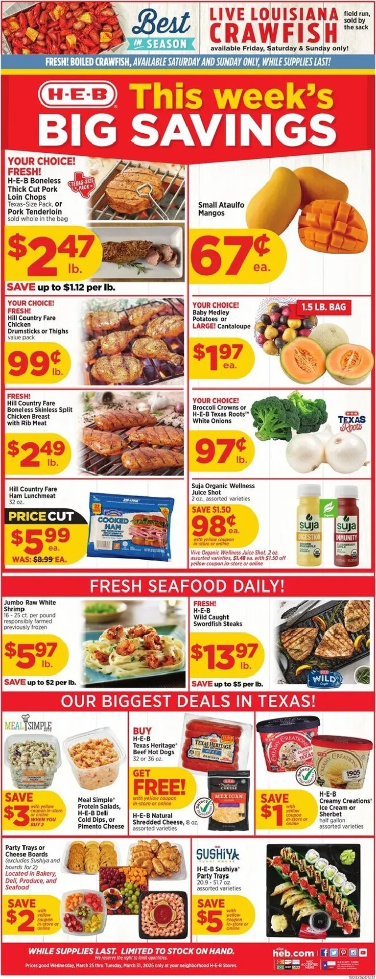 You’re viewing the H-E-B weekly ad, valid from 03/25/2026 to 03/31/2026. Visit our website regularly to stay up to date with the latest deals and promotions from your favorite stores.