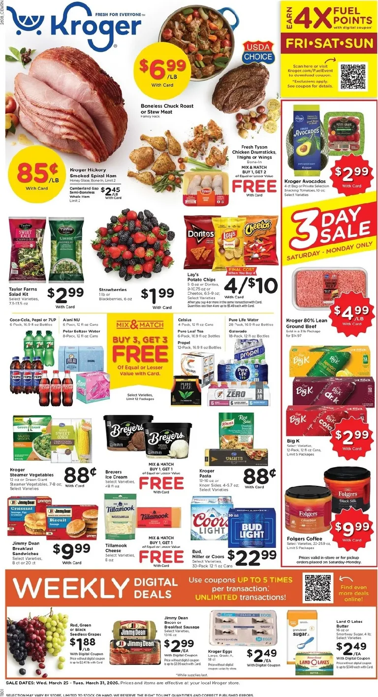 You’re viewing the Kroger weekly ad, valid from 03/25/2026 to 03/31/2026. Visit our website regularly to stay up to date with the latest deals and promotions from your favorite stores.