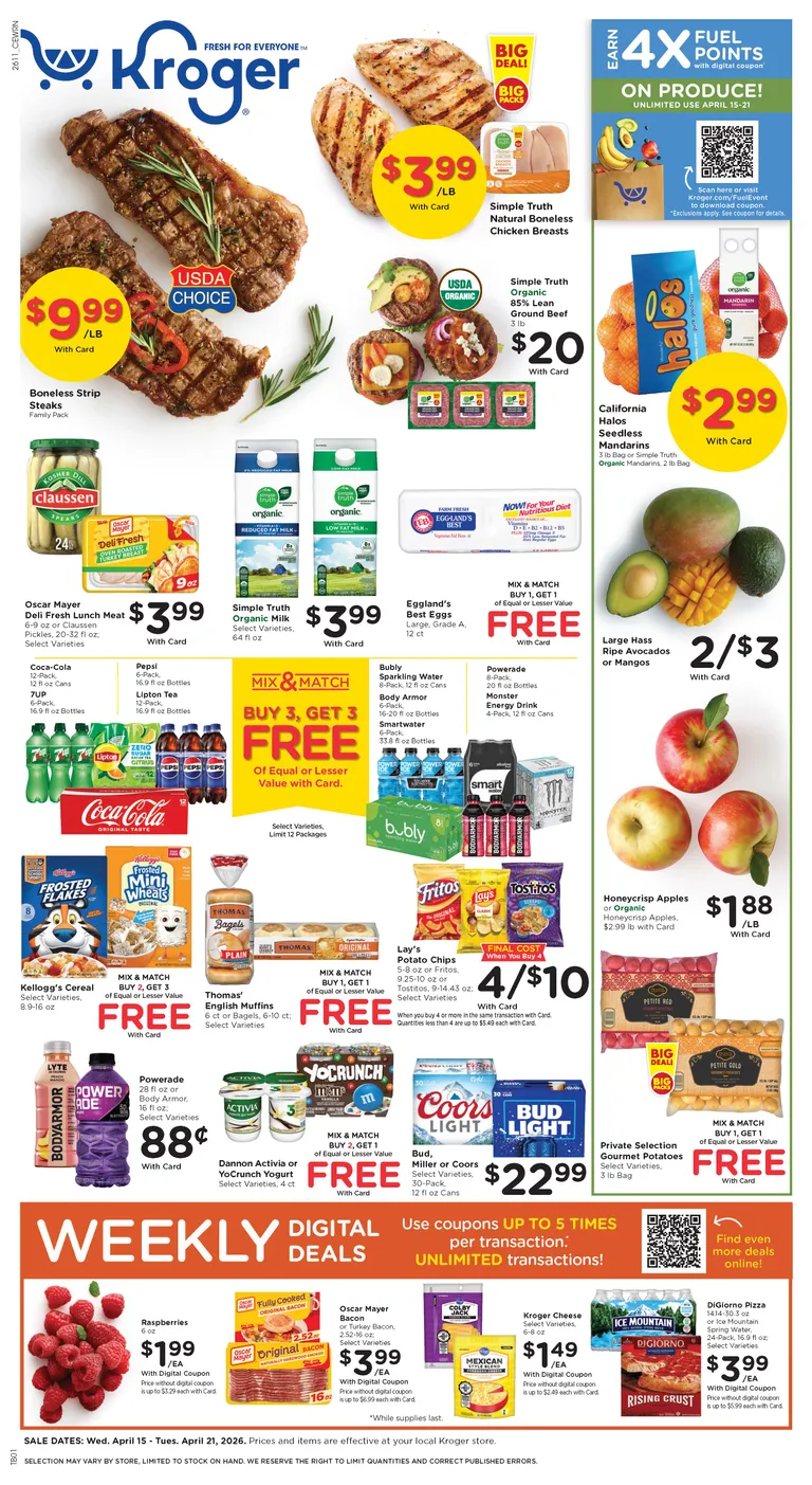 You’re viewing the Kroger weekly ad, valid from 04/15/2026 to 04/21/2026. Visit our website regularly to stay up to date with the latest deals and promotions from your favorite stores.