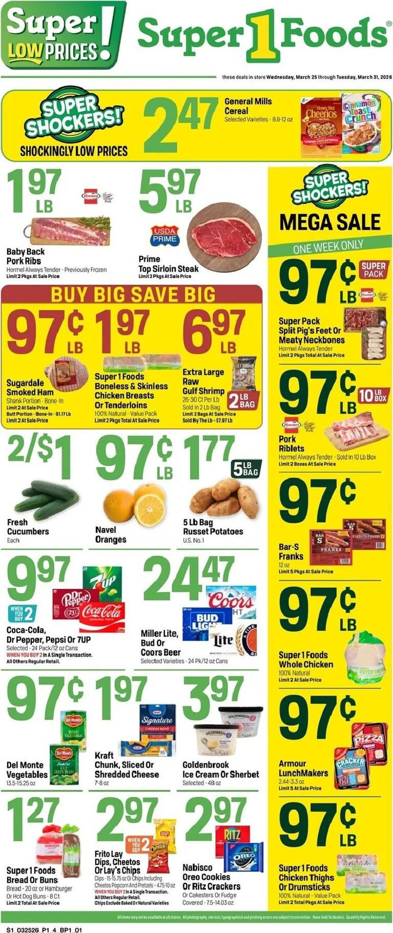 You’re viewing the Super 1 Foods weekly ad, valid from 03/25/2026 to 03/31/2026. Visit our website regularly to stay up to date with the latest deals and promotions from your favorite stores.